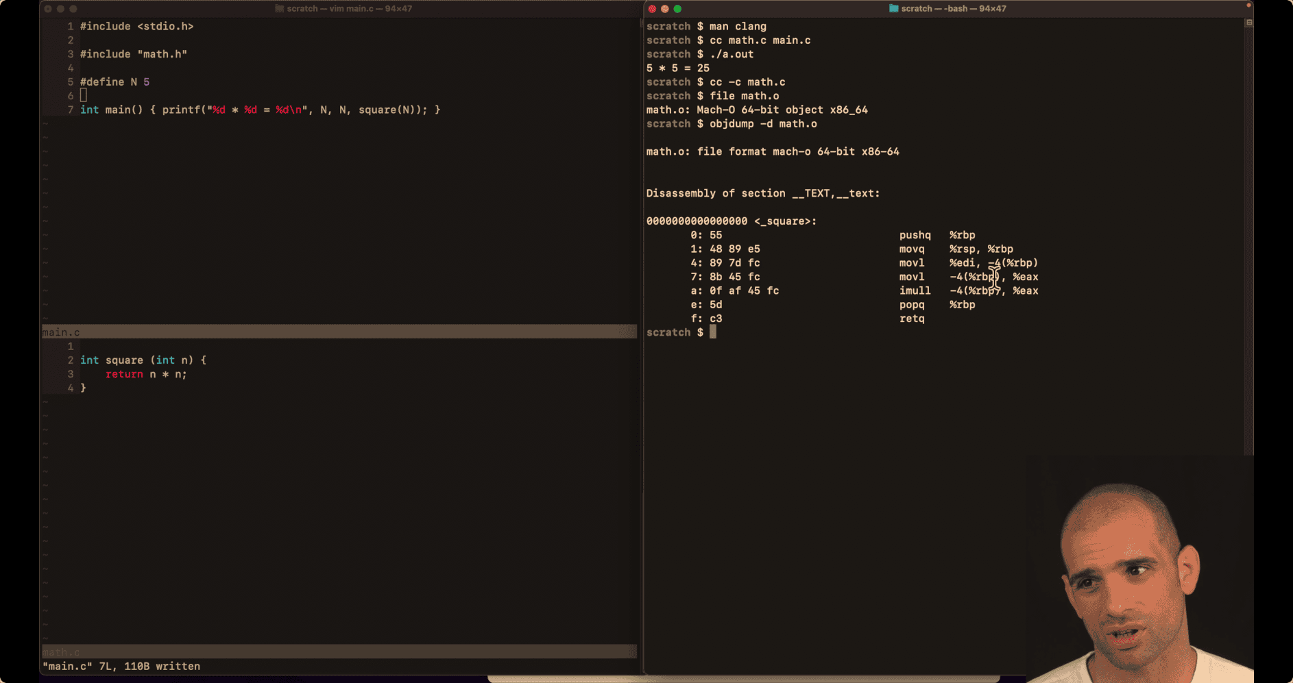 cc -S main.c -S Run the previous stages as well as LLVM generation and optimization stages and target-specific code generation, cat main.s