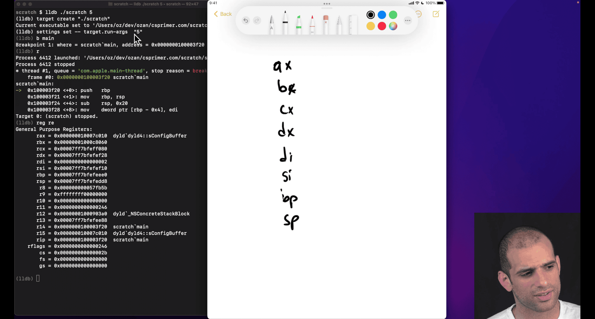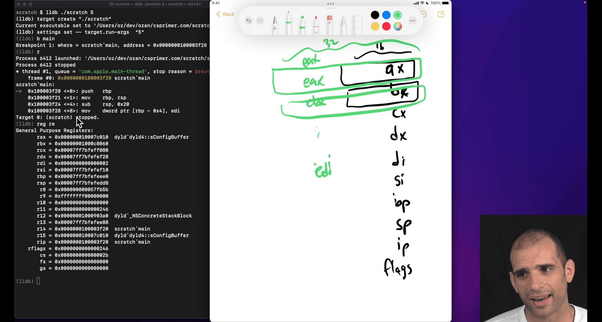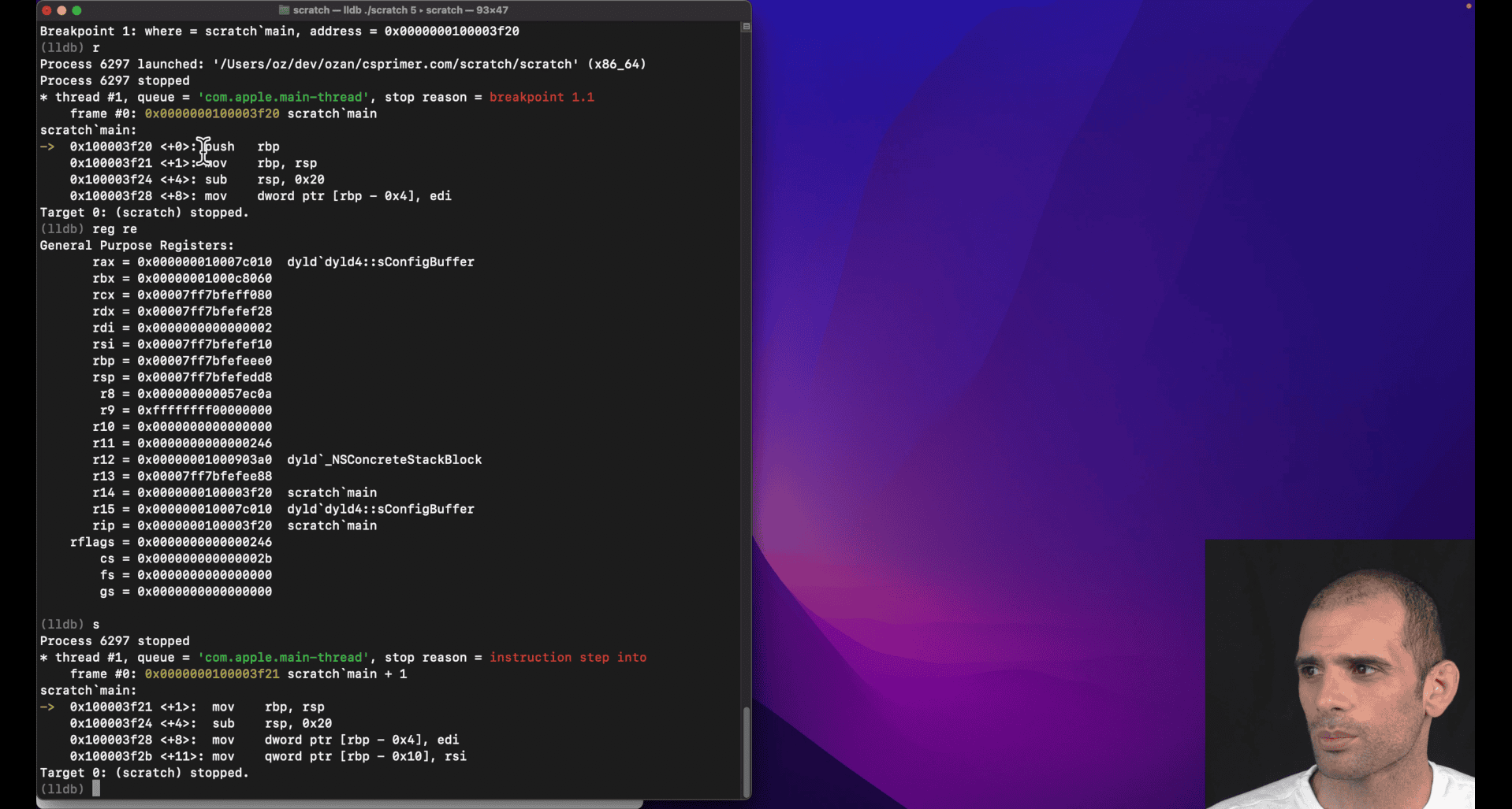 lldb , breakpoint , β run β register eax β step β or reg read (show all register)